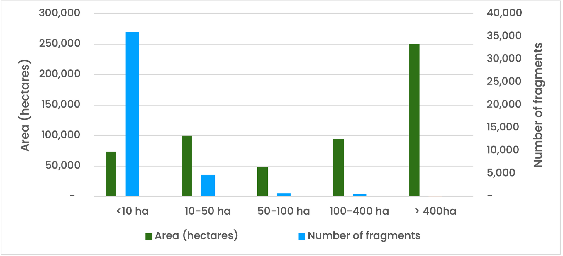 - ~45–50% of forest fragments are <10 ha