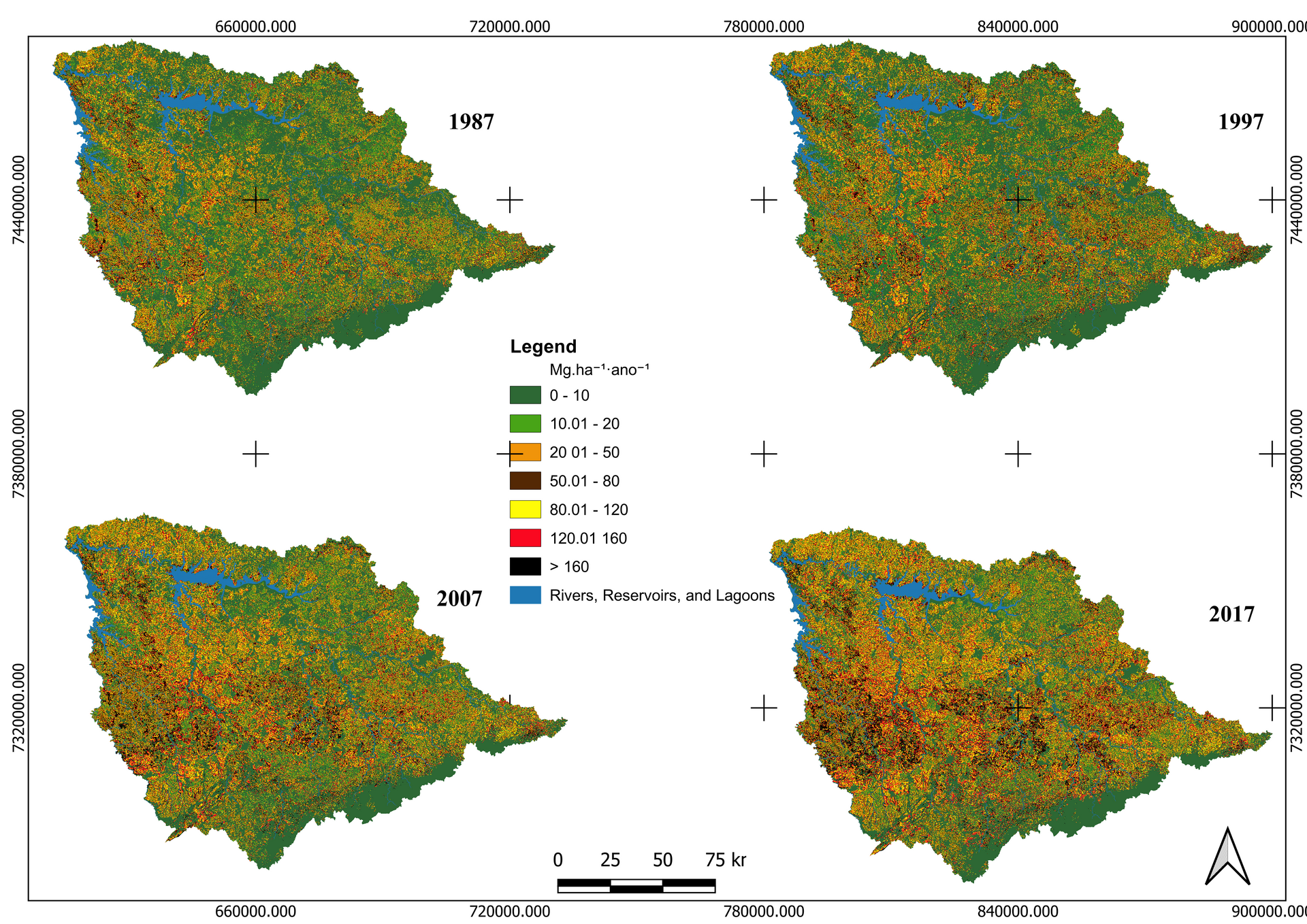 Sediment export increased from approximately 1.37 t ha⁻¹ year⁻¹ in 1987 to 4.1 t ha⁻¹ year⁻¹ in 2017